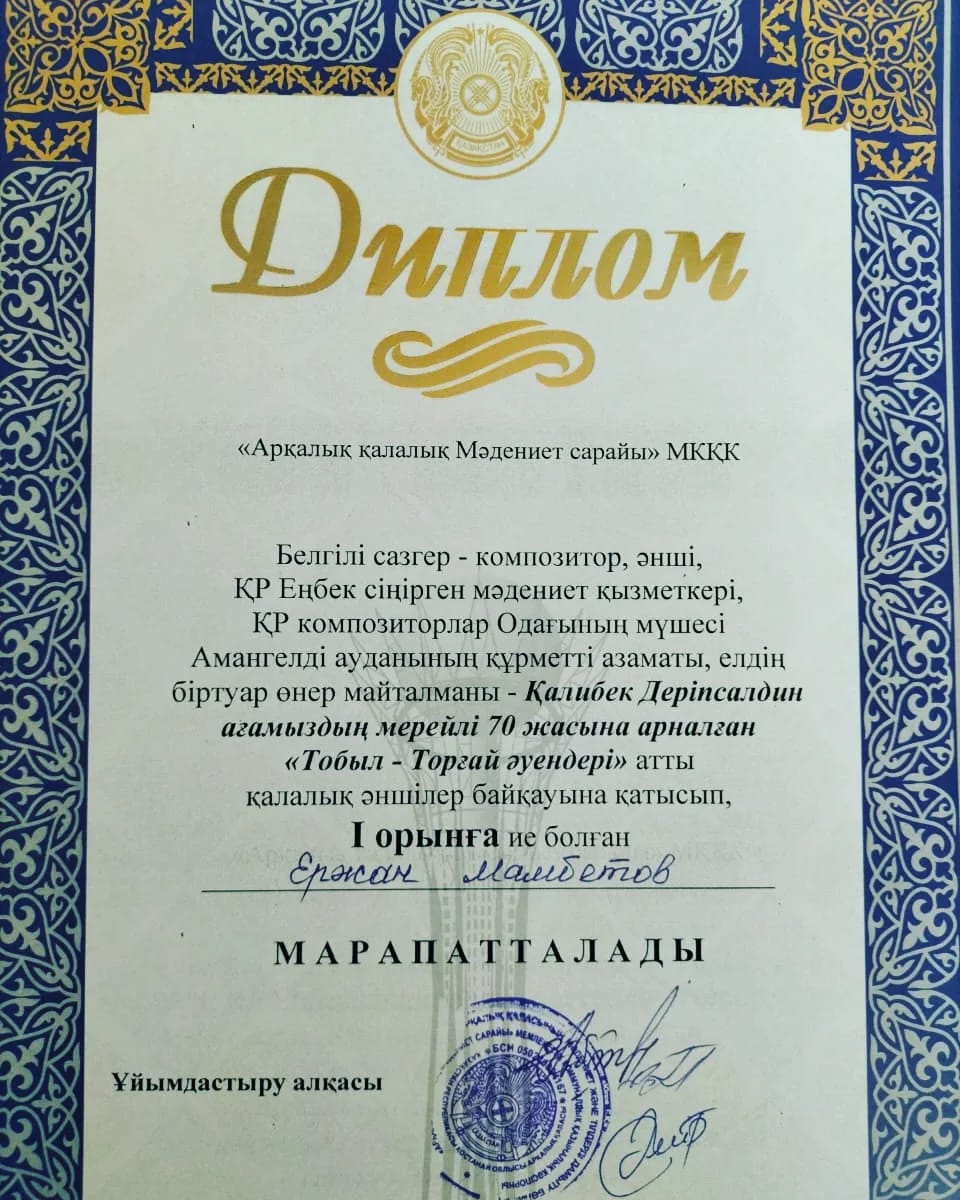 Қазақстан Республикасының Еңбек сіңірген мәдениет қызметкері, Қазақстан Республикасы Жазушылар Одағының мүшесі, Меценаттар клубы сыйлығының лауреаты, әнші - композитор, Амангелді ауданының құрметті азаматы, Торғайдың талантты ұлы, жерлесіміз Қалибек Деріпсалдиннің мерейлі 70 жасына арналған "Тобыл - Торғай әуендері" атты қалалық әншілер байқауы болып өтті.