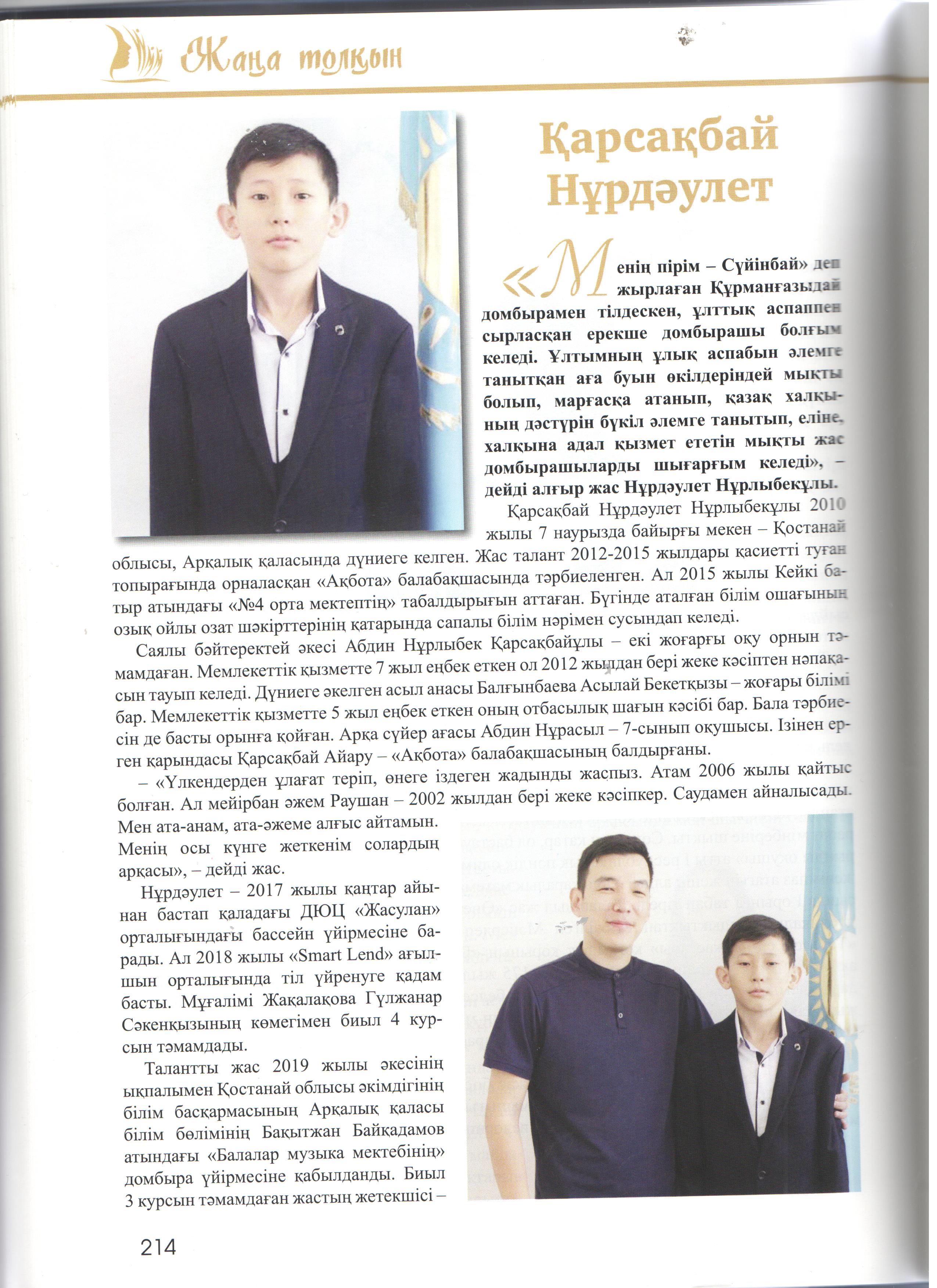 Домбыра сыныбының оқушысы Қарсақбай Нұрдәулет. Ұстазы - Айдаров Нұрхан Қабылахатұлы.