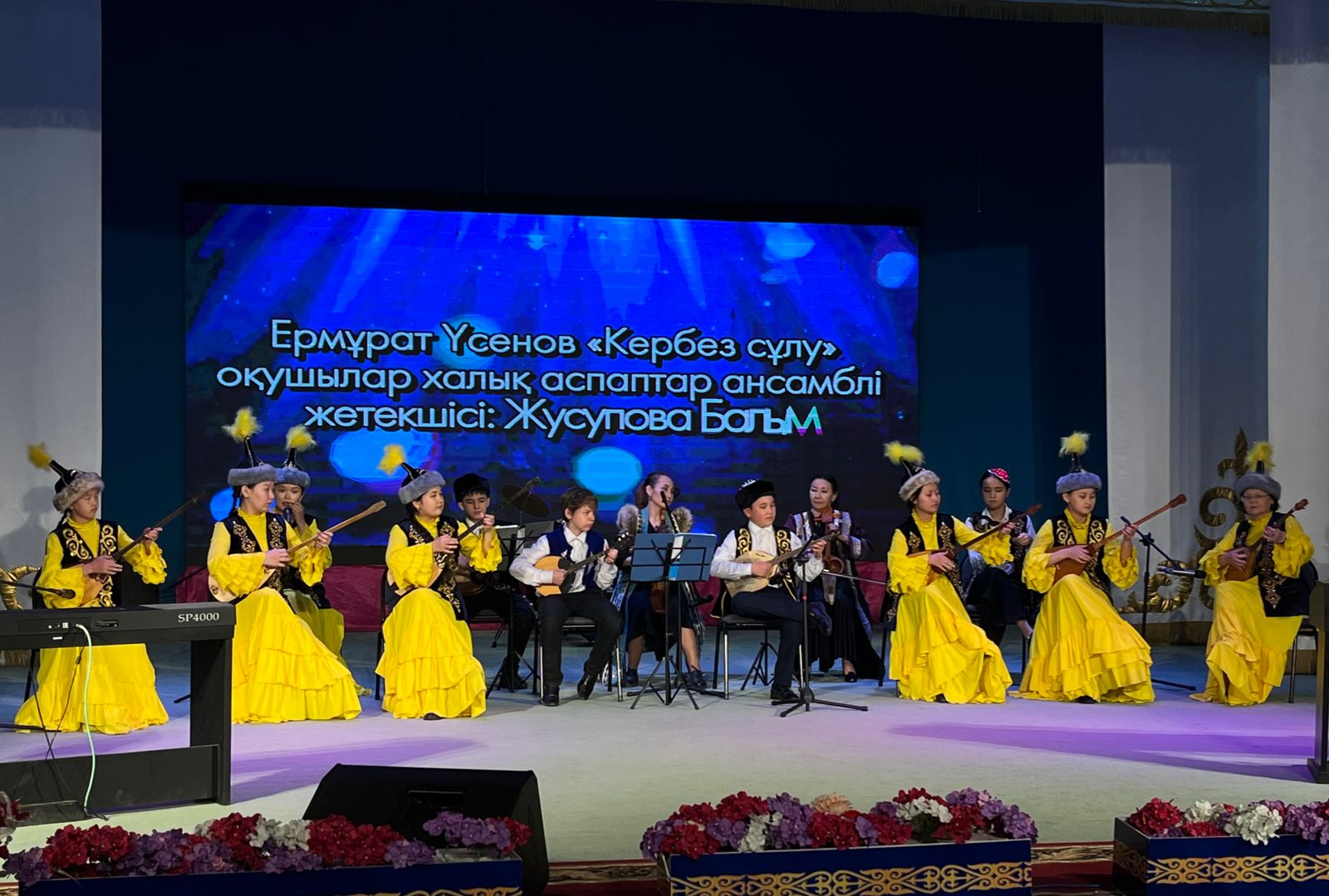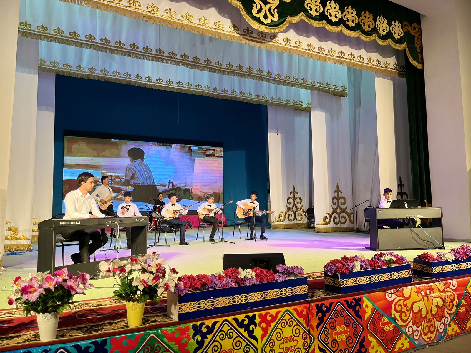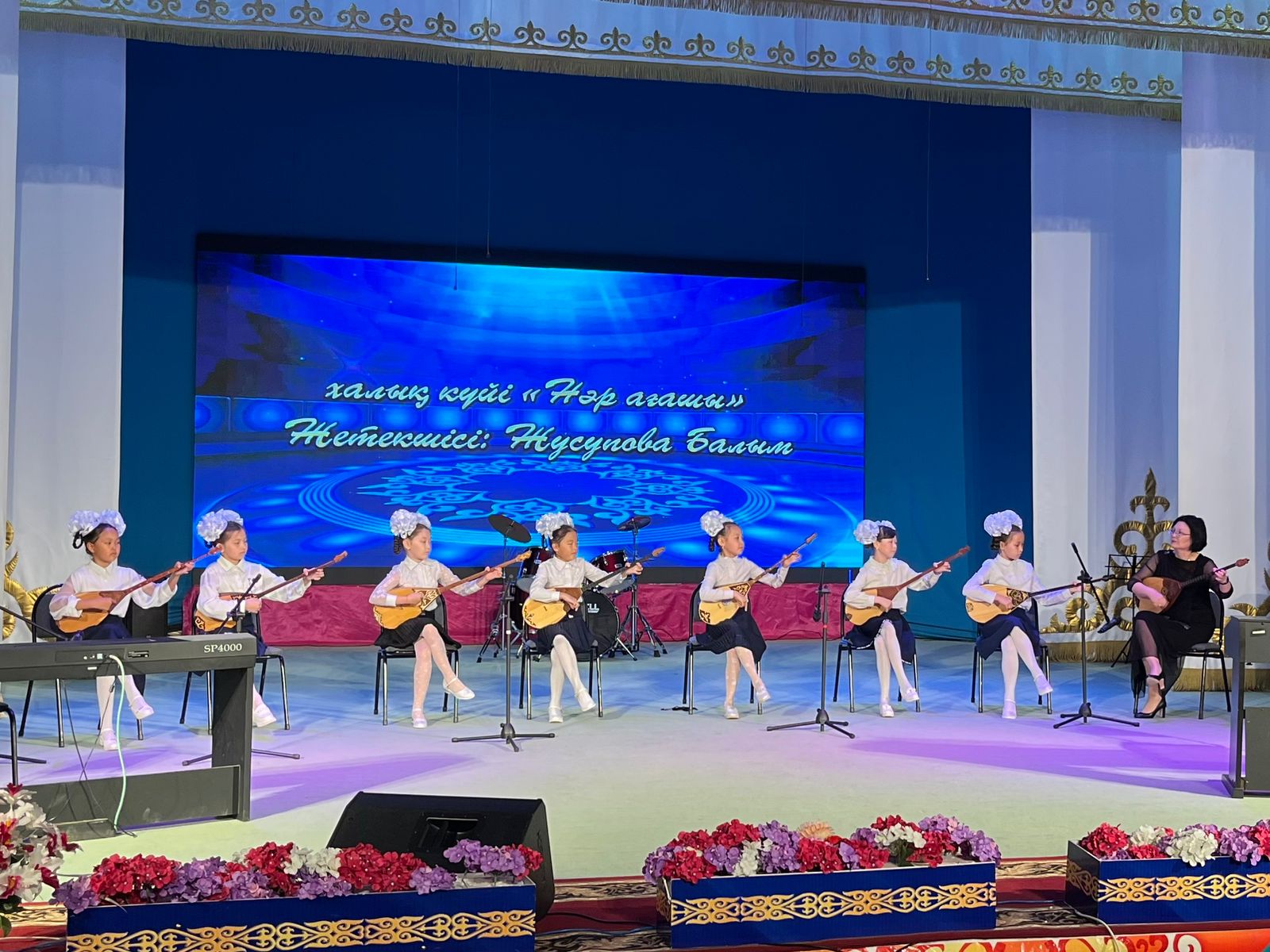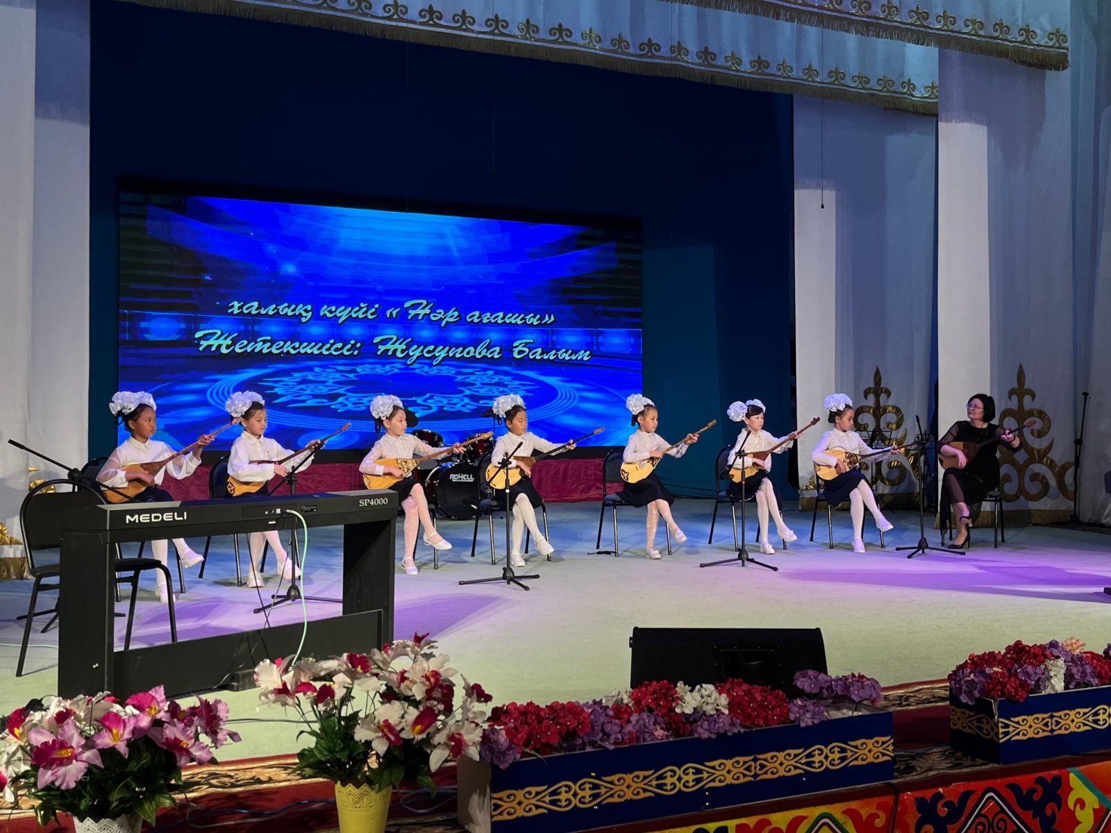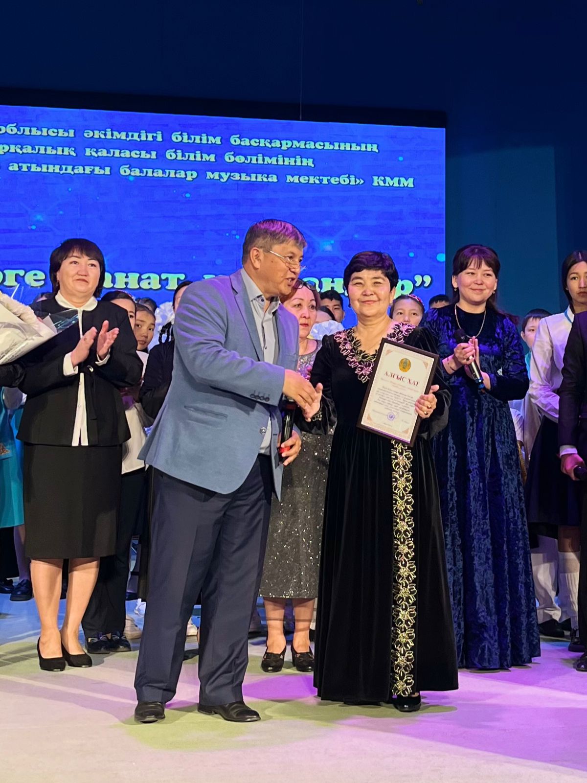 20 мамыр күні Қазақ жасөспірімдер театрында елімізде ЮНЕСКО көлемінде тойланып жатқан күй атасы - Құрманғазының 200 жылдық, ұлт ұстазы Ахмет Байтұрсыновтың 150 жылдық мерейтойға және ата-аналарға арналған облыстық «Үндестік» жобасы аясына орай мектебіміздің «Өнерге қанат қаққандар» атты жылдық есеп беру концерті өткізілді.Игі жақсылардың басын қосқан бұл концерттің алғашқы шымылдығын 80 оқушыдан құралған балалар оркестрі Құрманғазының күйі «Балбырауынды» дирижер Бөлтірікова Жақсыгүл Ибрагимқызының жетекшілігімен орындады. Концертіміз Ақанов Әділ Кәкиұлының жетекшілігімен қазақ композиторларының шығармаларынан құралған "Күй тартысқа" ұласты. Қорытынды бөлім барлық оркестр Н.Тілендиевтің «Әлқисса» күйімен тәмамдалды. Ақын аз Байтұрсынов Ахметтей, Сөзі алтын, мағынасы меруерттей дей келе А.Байтұрсыновтың «Аққұм» әнін вокал класының оқушысы, бірнеше дүркін республикалық, халықаралық байқаулардың жүлдегері Нұржайна Таубалды нақышына келтіре шырқады. Қазақстанда тұңғыш құрылған «Шертер» фольклорлы- этнографиялық ансамбльдің әншілері Сайлаубек Ордабаев пен Отаркүл Мұқатованың немерелері Томирис, Альмира және Нұрғисса Сайлаубектердің орындауында Халық күйі «Қара жорға» орындалса, болашағы көп үміт күттіретін шәкірттеріміз Аяулым, Айдана, Алихан, Адилет Абдибековтер Кармайклдің «Сердце и душа», Айтқали Жайымов «Шалқыма» орындайтын домбыра класының оқушысы, облыстық, республикалық, халықаралық байқаулардың лауреаты Қадыр Нұрәли, концертмейстер Бондаренко Римма. Құрманғазы, Тәттімбет бабамыздың, Дина анамыздың күйлерін санасына сіңірген шәкірттеріміз Ермұрат Үсеновтің «Кербез сұлу» шығармасын оқушылар халық аспаптар ансамблі Балым Жусупованың жетекшілігімен орындап берді. Домбыра, қобыз, сені ойнатамын,Толғау сап, төңіректі ойлатамын дей келе, Мұқан Төлебаевтың «Кестелі орамал» туындысын қобызшылар ансамблі Райхан Хасенова мен концертмейстер Жумаш Молдажанованың жетекшілігімен орындап, көрерменнің ыстық ілтипатына бөленді. Мектебіміздің ең жас күйші қыздарының орындауында халық күйі «Нәр ағашы» Б.Жусуповның жетекшілігімен. Абдулхамит Райымбергеновтың шығармасы «Секіртпе» Әсел Кәрібаеваның жетекшілігімен домбырашылар ансамблі қоңыр домбыраның күмбіріне бөледі. Көптің көңілінен шыққан концертіміз орындайтын шәкіртіміз Назым Алтынбаеваның орындауында, Жумаш Молдажанованың күйсандықта сүйемелдеуімен халық әні «Дайдидаумен» жалғасты. Дәстүрлі ән класынан құралған дуэт халық әні «Үш меркі» әнін тарту етті. Роза Газизованың жетекшілігімен аккордеоншыларымыз да қалыс қалмай, Шуберттің «Экосез» туындысын орындап берді.Вокалдық ансамбль жетекшісі Гүлнұр Баяхметованың орындауында ешқашан ескірмейтін «Қазақ әндерінен попурри» орындалды. Марат Бердіғұловтың «Ақсауыт» шығармасы жетекшісі Ә.Ақановтың «Арқа сазы» ұлт аспаптар ансамблінің орындауында көпшіліктің құрметіне бөленді. Шәмші Қалдаяқовтың «Теріскей» әнін О.Қапан нақышына келтіре шырқады.Денеңді шымырлатып, толқытатын, Мәңгілік басымды ием, өнерге мен демекші, Т.Мұханбетжанов «Детство» шығармасы С.Шайхин жетекшілік ететін БЭНД Байқадамов. Карл Дженкинс "Палладио" орындайтын ансамбль жетекшісі Райхан Хасенова. «Я люблю кофе» орындайтын бірінші сынып оқушылары, жетекшісі Молдажанова Жумаш. Алтынайдың күйі «Ақжелең» орындайты