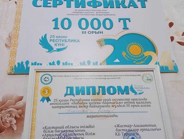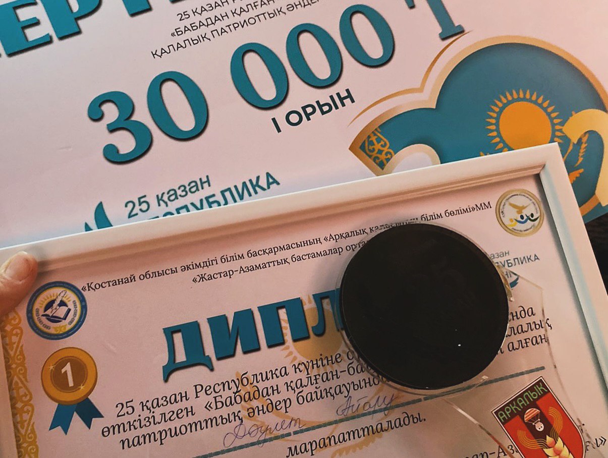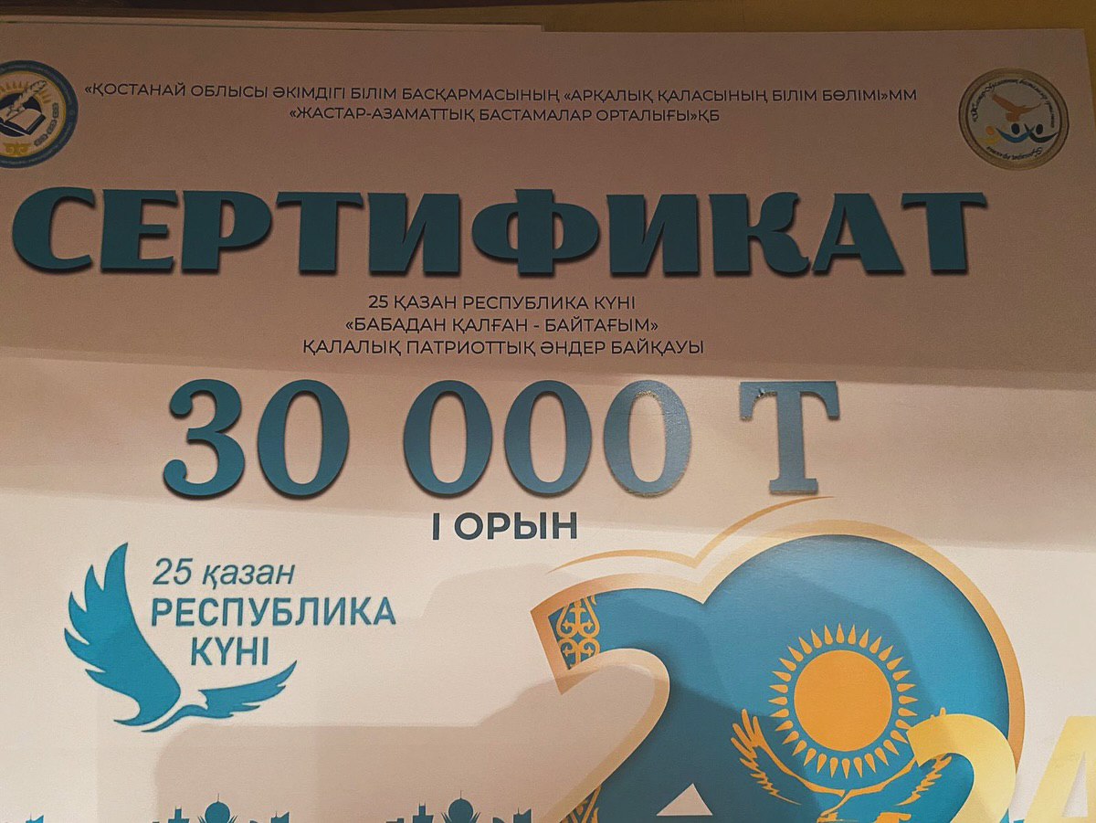 24 қазан күні Арқалық қаласы Ә.Боранбаев атындағы кинотеатрында «Жастар-Азаматтық бастамалар орталығы» қоғамдық бірлестігінің ұйымдастыруымен 25 қазан Республика күніне орай өткізілген «Бабадан қалған-байтағым» атты қалалық оқушылар арасындағы патриоттық әндер байқауында вокал бөлімінің оқушылары Дәулет Айару 1 орын алып, арнайы «Арқалық қаласы білім бөлімі» ММ басшысының және «Жастар-Азаматтық бастамалар орталығы ҚБ» төрағасының дипломы мен 30 000 теңге сертификатына ие болды. Ал Кенжебай Айару 3 орын және 10 000 теңге сертификатын иеленді. Жүлделі орындарымен шын жүректен құттықтай отырып, әнші қыздарымызға алдағы үлкен байқауларда тек шығармашылық шабыт тілейміз! Жетекшісі — вокал бөлімінің мұғалімі Баяхметова Гүлнұр Балташовна.
