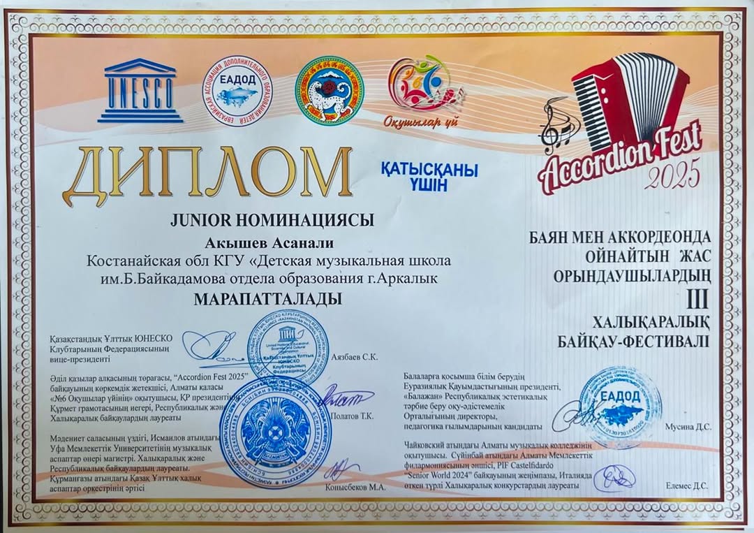 01. 03. 2025 жылы "Біртұтас тәрбие" бағдарламасы аясында, 1 наурыз - Алғыс айту күні мерекесіне орай, Алматы қаласы Білім басқармасы N6 Оқушылар үйінің ұйымдастыруымен өткен КМҚК ЮНЕСКО Клубы ІІІ Халықаралық «Accordion fest» байқауына қатысқаны үшін Б.Байқадамов атындағы балалар музыка мектебінің мақтанышы, мектебіміздің дарынды оқушысы Ақышев Асанали марапатталды.