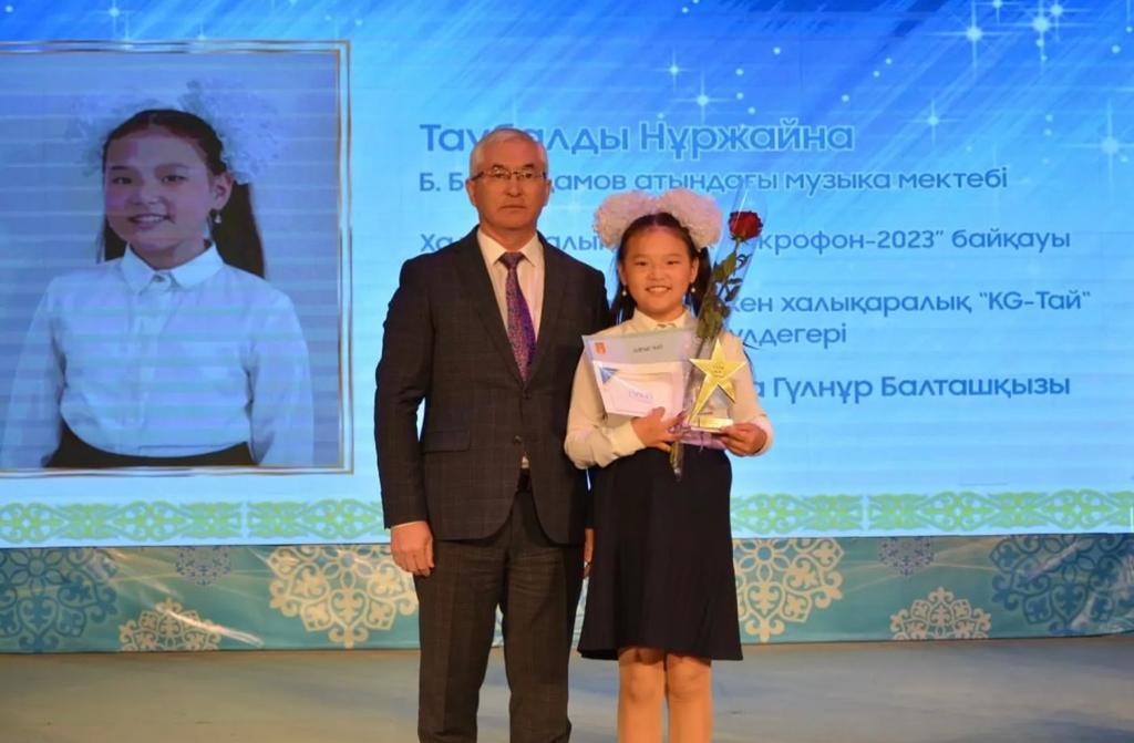 Арқалық қаласында “Арқалық қаласы білім бөлімі”ММ-нің ұйымдастырылуымен биыл екінші жылы дәстүрге айналған жасөспірімдер театрында халықаралық,республикалық,облыстық деңгейдегі байқаулар мен спорттық жарыстарда жүлделі орындарға ие болған мектеп оқушылары және олардың жетекшілерін марапаттау мақсатында “Жұлдыздар шеруі-2023” салтанатты жиыны өткізілді.Қала әкімі Асанов Әмірхан Біркенұлының қатысуымен өткен бұл жиында біздің мектебіміздің үздіктеріде назардан тыс қалмады.Атап айтатын болсақ,жақында халықаралық “Алтын микрофон-2023”байқауының 3 орын иегері,мектебіміздің кішкентай жарық жұлдызы болған,вокал класының 1 сынып оқушысы Таубалды Нұржайна мен осы салада еңбек етіп,биылғы жылы оқушысының түрлі байқаулардан алдыңғы қатардан көрінуіне тер төгіп,аянбай еңбек етіп келе жатқан жетекшісі Гульнур Балташовнаға арнайы қала әкімінің дипломдары мен ақшалай сыйлықтары табысталды.Жылдың жақсы нәтижесі есебінде биіктерді бағындыра білген оқушымыз мен жетекшімізді кезекті жеңістерімен шын жүректен құттықтай отырып,жаңа оқу жылыңда тек осындай үздіктердің қатарынан көрініп,қоржындарынызда жетістіктеріңіз әлемдік деңгейдегі түрлі байқауларды бағындыра беріңіздер деген шынайы ақ жүректі тілегімізді білдіреміз!Жарайсыздар біз сіздермен әрқашан мақтанамыз!Қанаттарыңыз талмасын,өнерлі өнерпаздар!